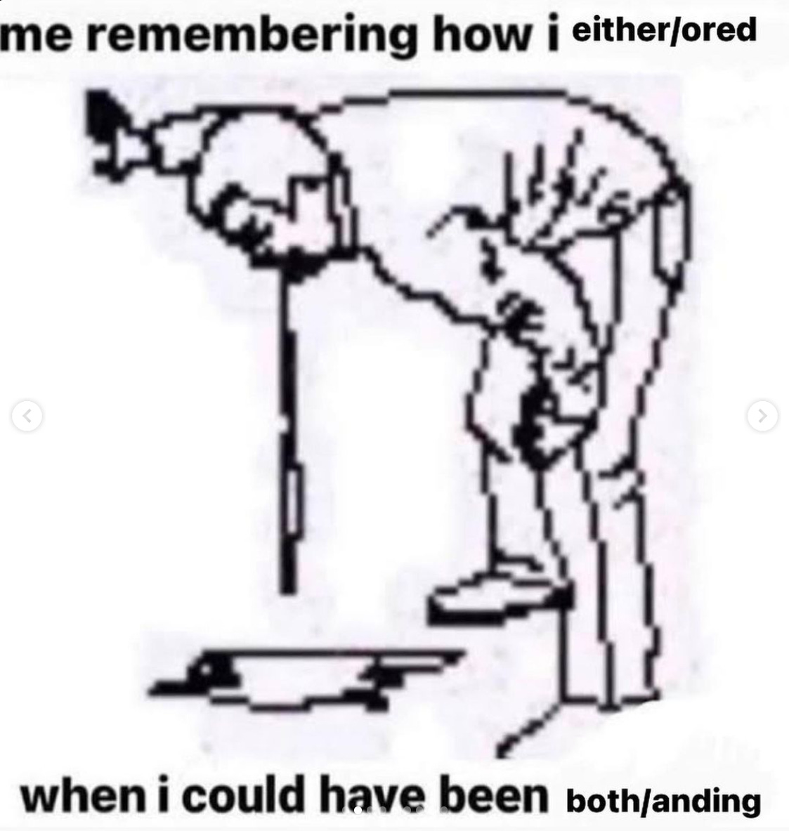~~~Our society~~~ (‘our’ is subjective as hell but you get me), is fucking obsessed with the first 2. I see this as the indoctrination of ‘what do you want to be when you grow up?’, as algorithms needing a definable niche or else you won’t be promoted, as a disregard for alternate paths, as trend setters and the followers who make it grow, as inconsistency being seen as a moral failing, as the seasons being taught as 4 in climates with 7 of them, as the difficulty to withstand dialectical discomfort and a ravenous clawing for either/or, right/wrong, yes/no and the social consequences of this (detrimental leftist identitarianism, cancel culture). Tiring.
